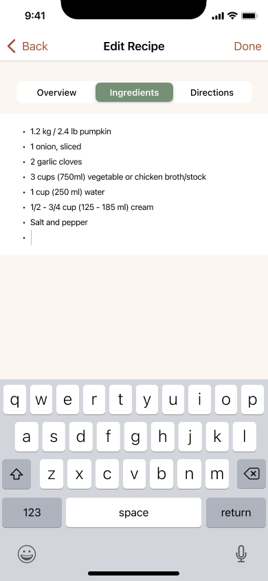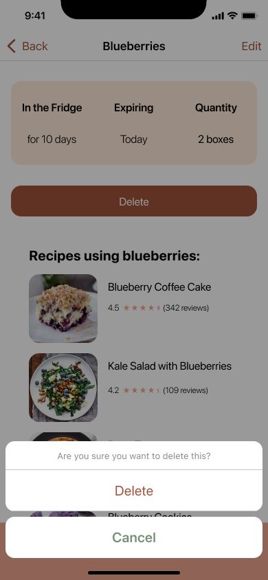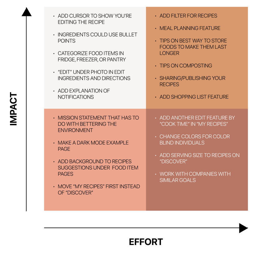 The majority of the feedback I received was suggestions for minor changes or features that could be added in the future. For the minor changes, I took into consideration the pain points of users and what they couldn’t find immediately. If it took more than a few seconds, I knew it needed to be changed. Users had the most difficulty with the last task—editing the recipe, so I made iterations to make it more seamless. As for the features that could come later, I added them to the high-impact/high-effort category of the Priory Matrix. My main focus was iterating on features in the high-impact/low-effort category.