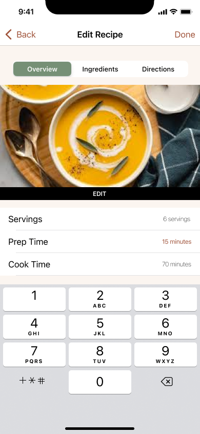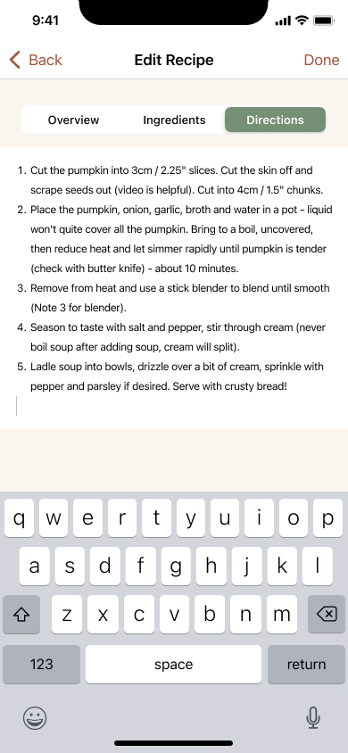 Edit cook time, add an ingredient, and change a step in the directions in Pumpkin Soup Recipe under “My Recipes”