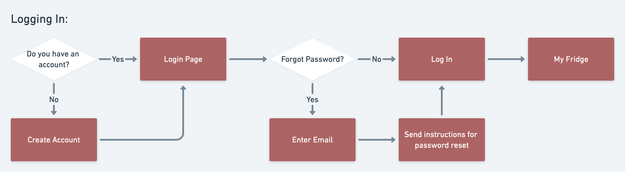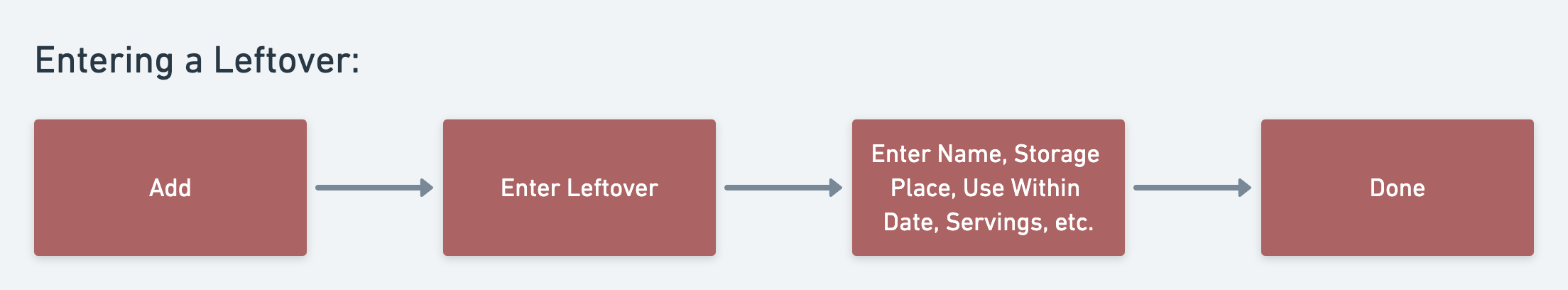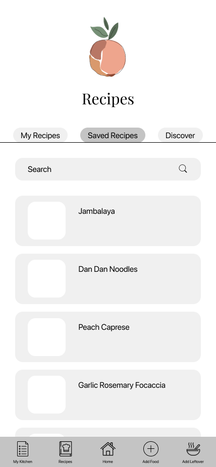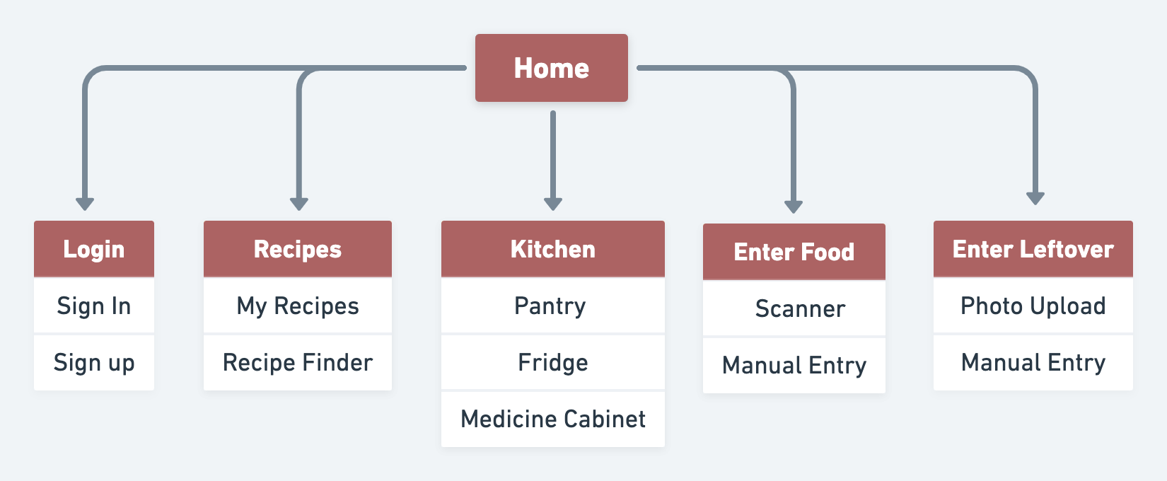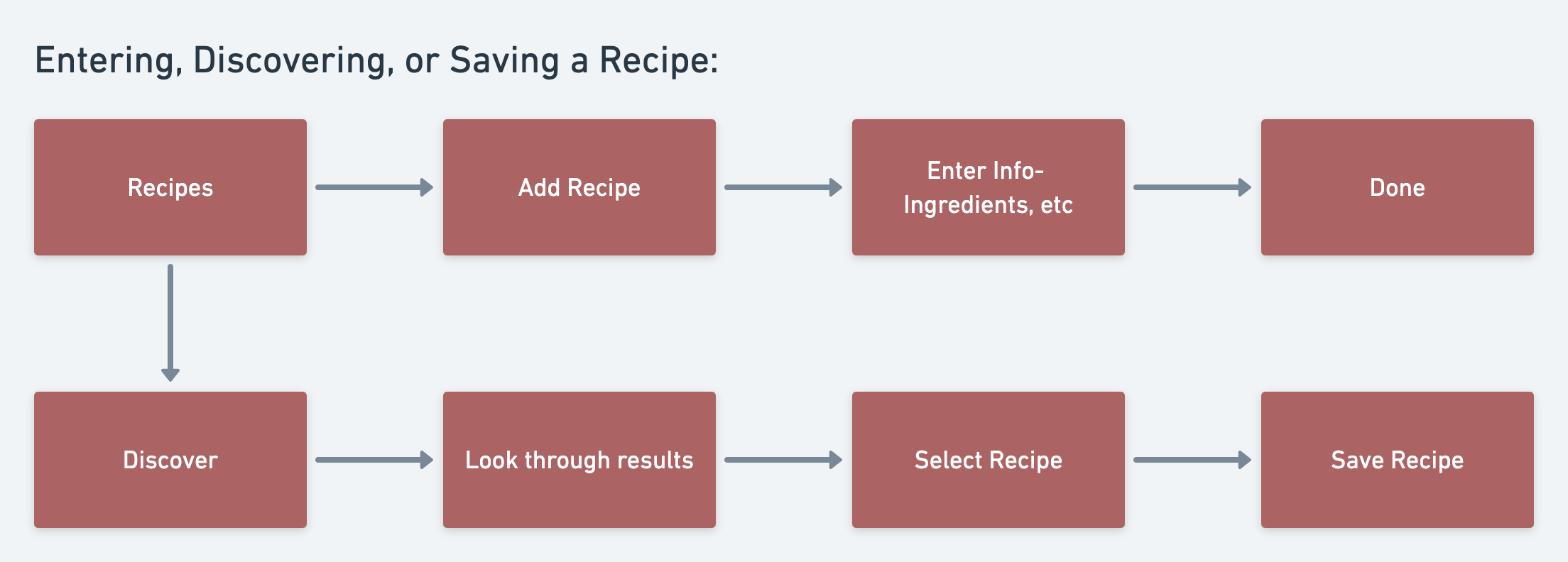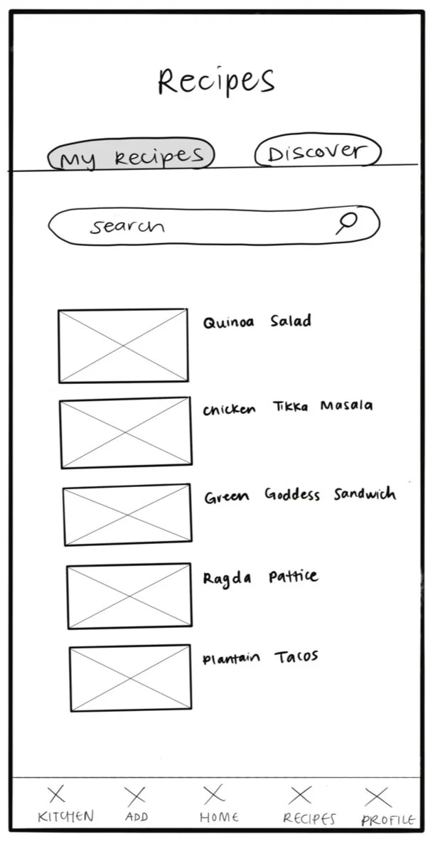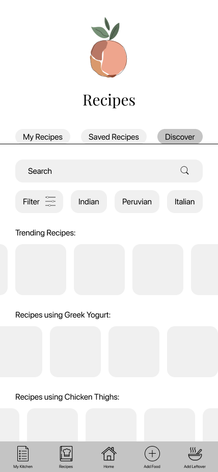 Using the same tool, I created three flows based on my sitemap. The first flow outlines the login process; Every user needs to create an account to use the app. The second flow shows how to add a leftover to “My Kitchen.” Lastly, the third flow outlines the recipe page—either entering your own or discovering new recipes and saving them.