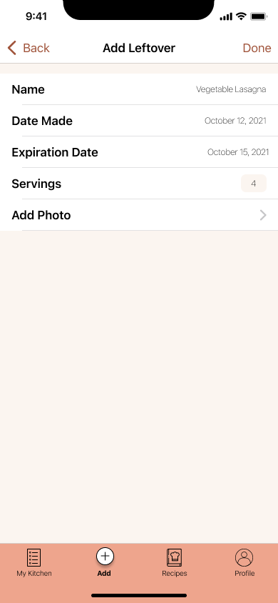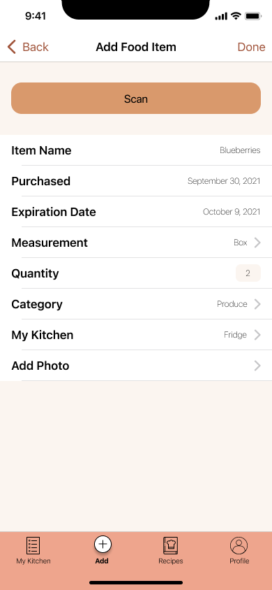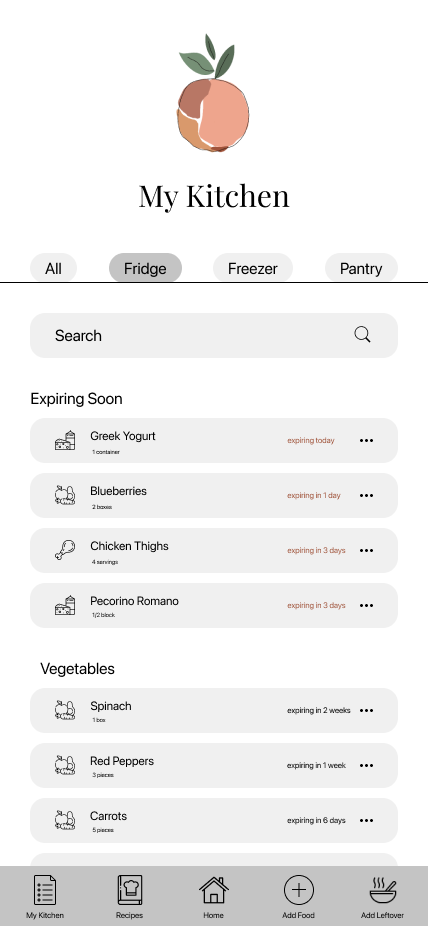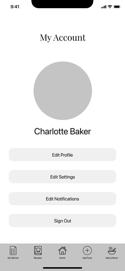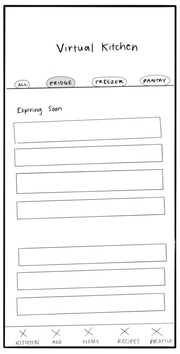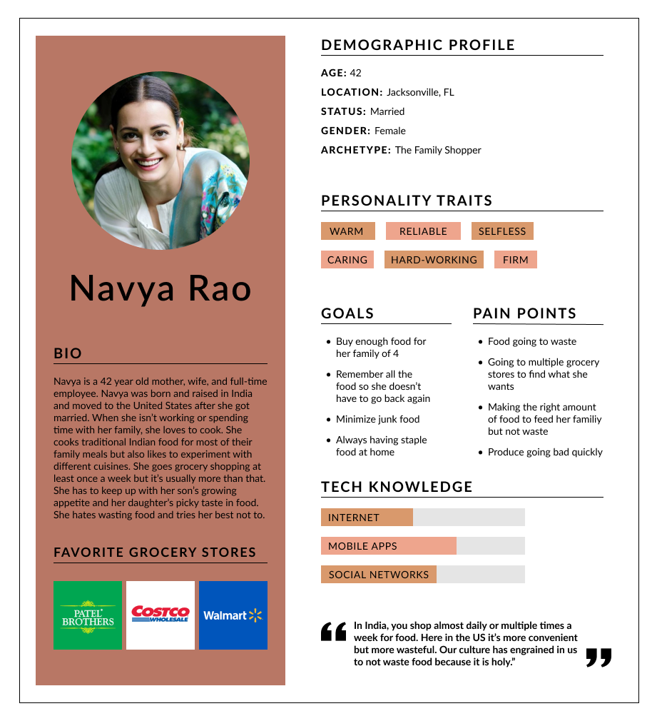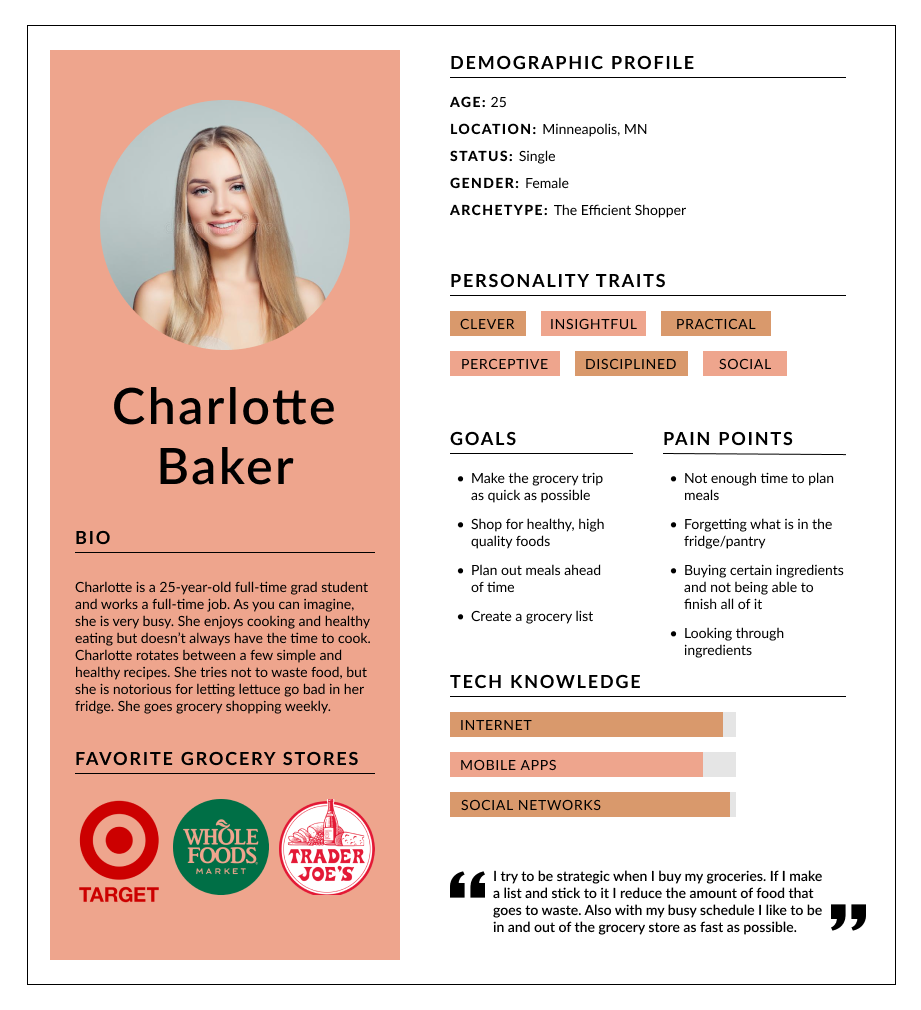 From the user research, I analyzed the results and created two personas for the app. These personas will be used as a representation of who I’m designing for throughout the design process. Charlotte is a single female with a busy schedule and wants to keep track of her groceries in an orderly manner. Navya is a mother who loves to cook and tends to overbuy groceries. She hates wasting food, so she wants to get better about keeping track of what she has.