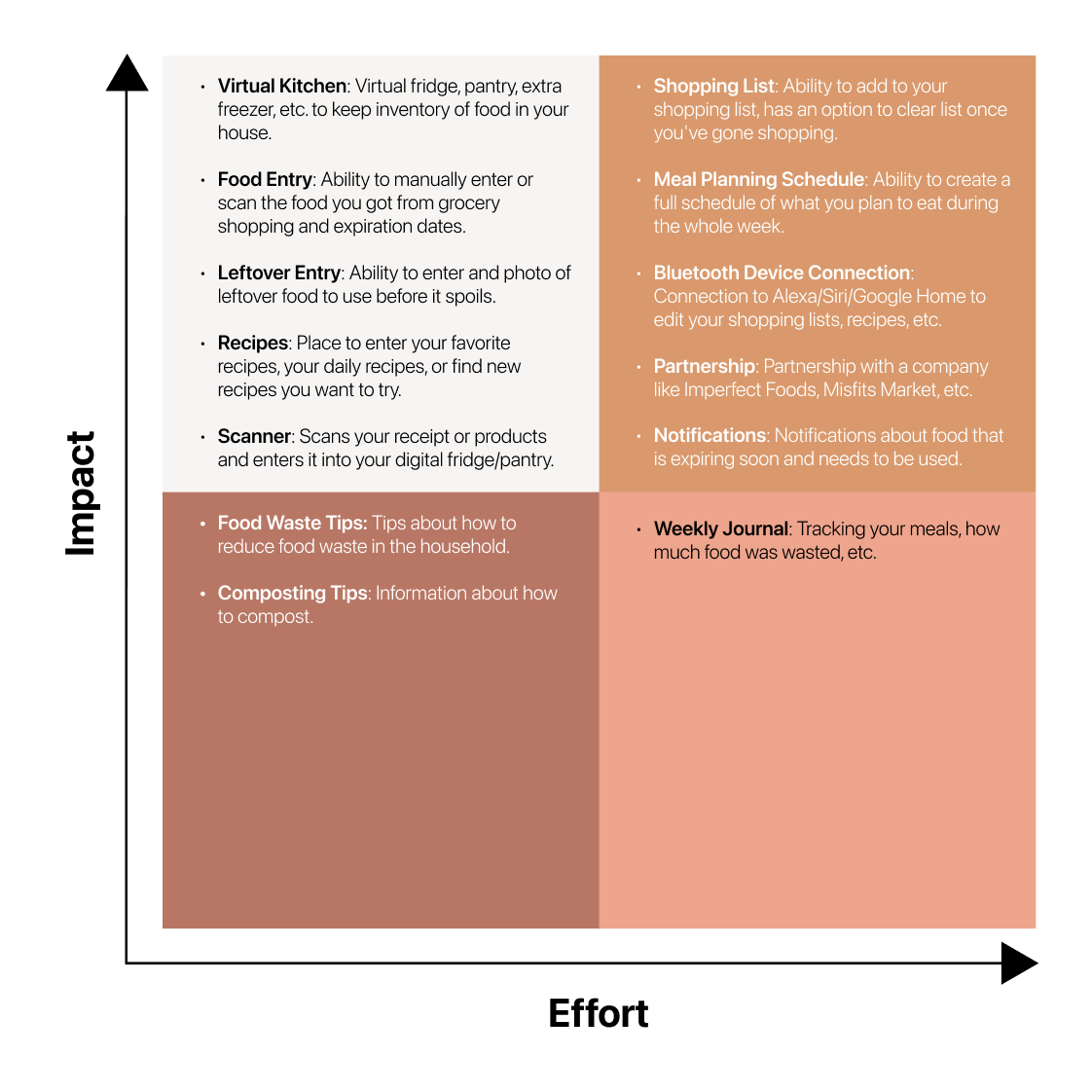 After creating my personas, I made a prioritization matrix by categorizing features based on levels of importance. I had many feature options that I wanted to include, but I had to narrow it down to what I thought was the most important.