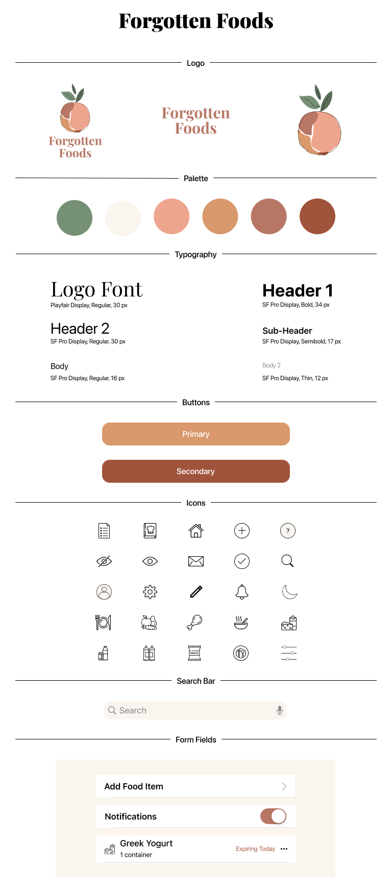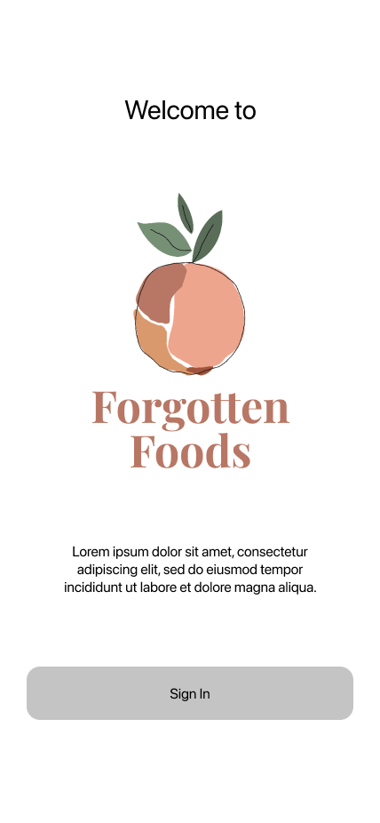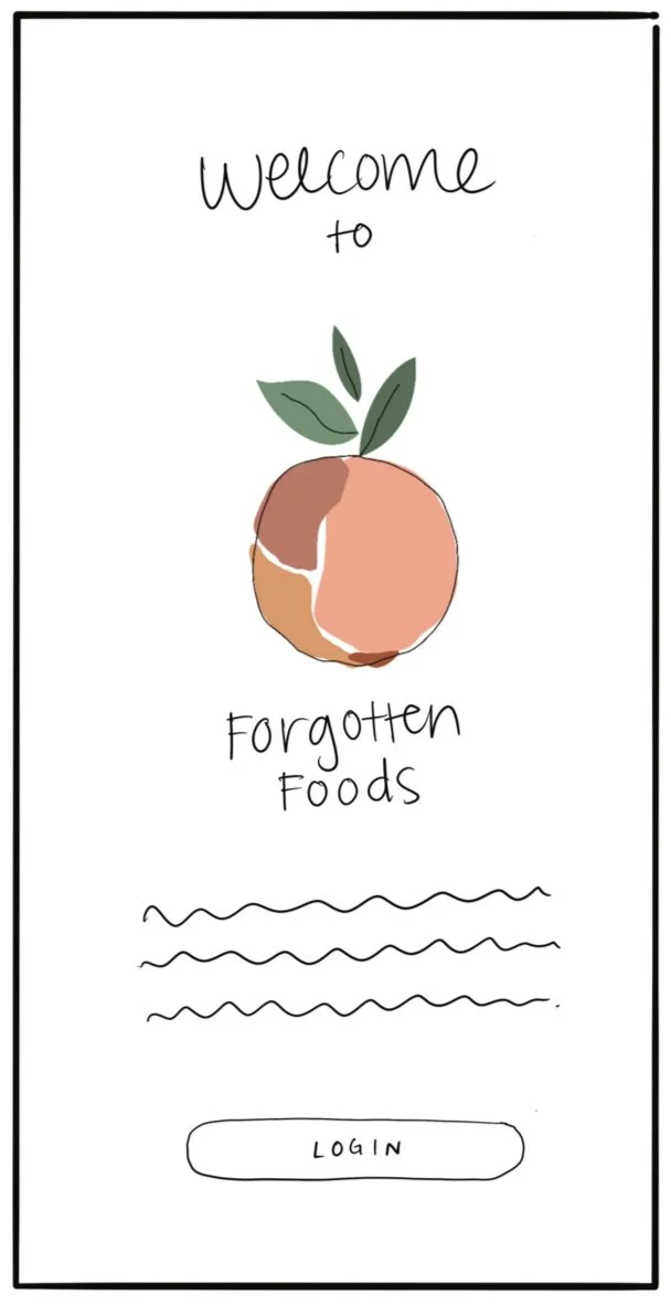 The next step was to create a brand for Forgotten Foods. I wanted the colors to reflect fresh produce so I chose shades of red, orange, pink, and green as an accent. Using Procreate on my iPad, I began designing the logo. I tried different fruits—strawberry, peach, and lemon. I finally decided to go with an abstract peach.