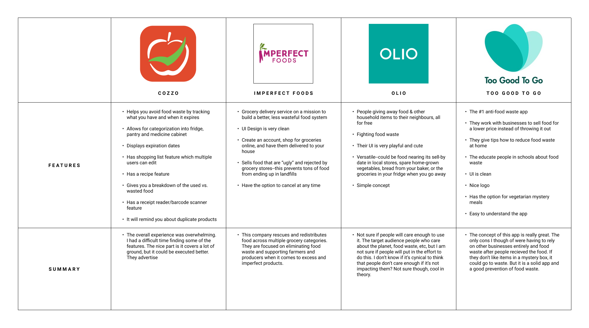 After my background research on food spoilage in US households, I did competitor research based on similar apps. I looked at what level of food waste they are tackling and what features they have to offer. I wanted to figure out what will set Forgotten Foods apart from similar mobile apps.